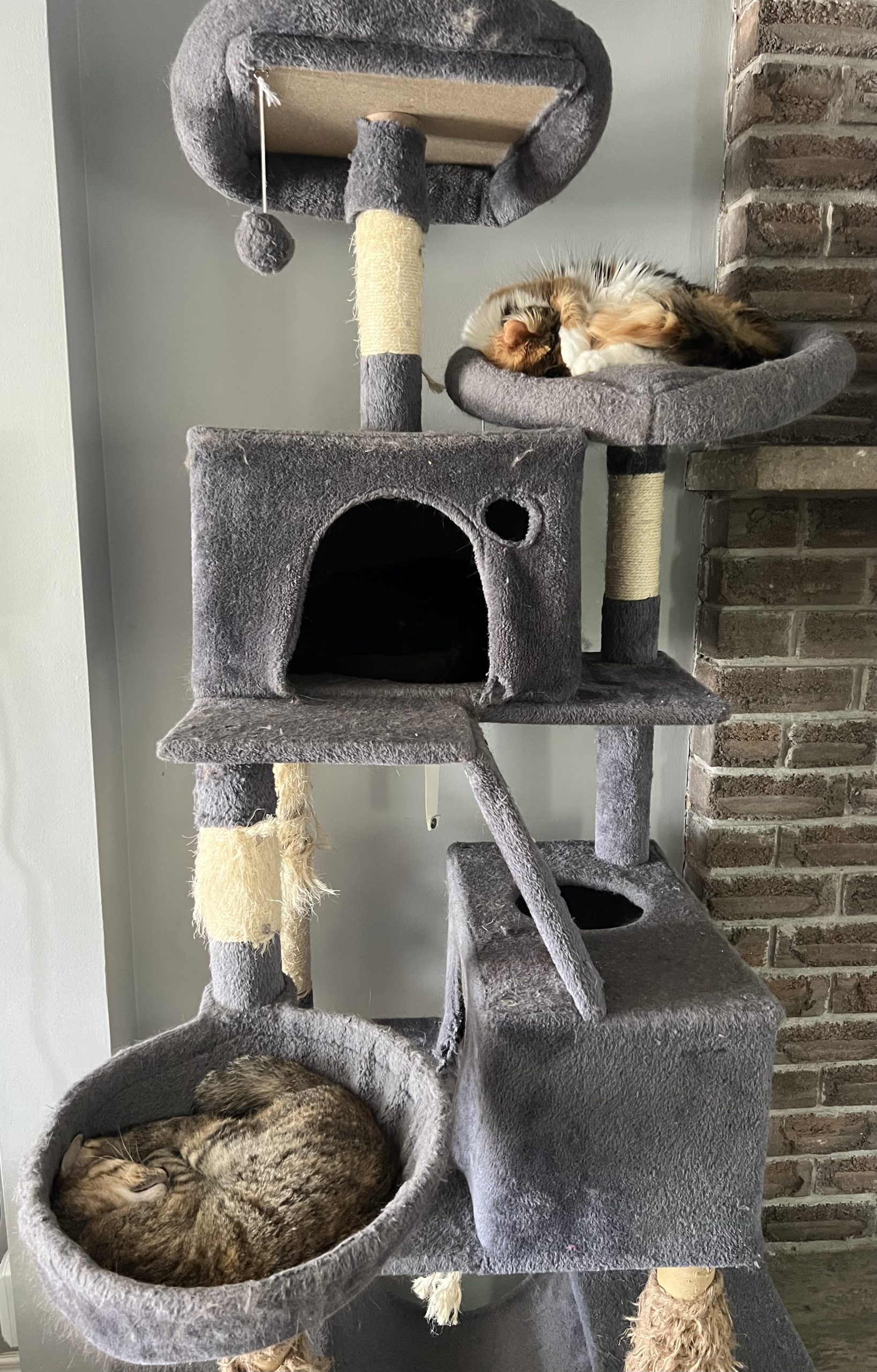 Cats relax in warm, cozy beds or high perches with soft blankets and low stress.