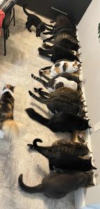Organized food row ensures every cat gets their daily meals and water with care and routine.