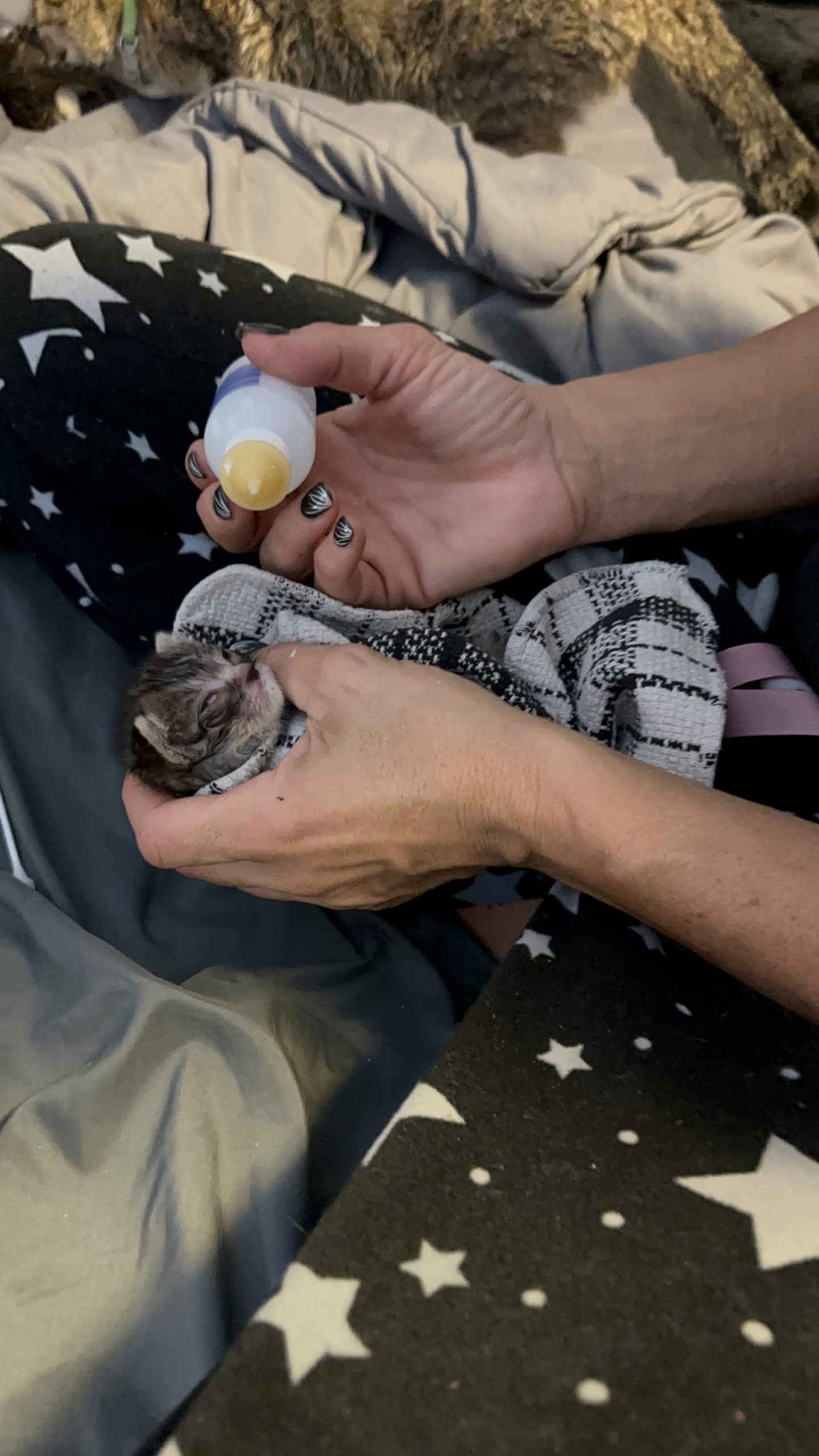 A sick mother cat was dropped off here while pregnant. She gave birth to four sick babies, and after a week, she became too ill to continue nursing them. She abandoned the kittens, leaving me to bottle-feed them in hopes of saving their lives.